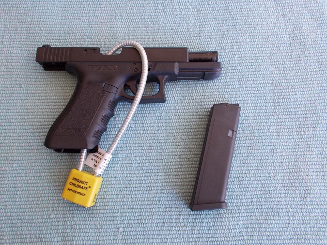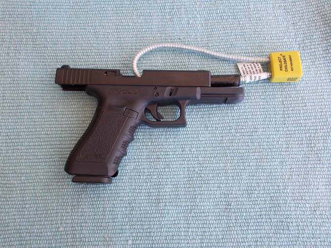 These are inexpensive or can be obtained for free some police departments and firearms dealers and local firearms organizations.  A firearms lock is included with any recent firearm purchase, often this is a are cable lock.