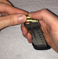 5. Using your right thumb, press down on top of the round so it goes below the feed lips, and then use your right thumb and left hand together to slide it backwards into the magazine, underneath the feed lips.